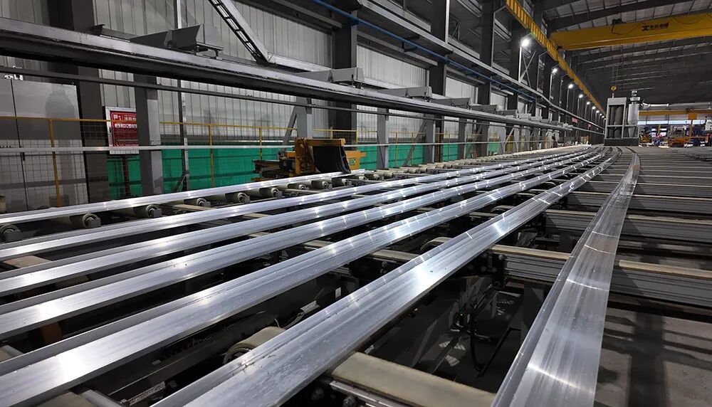 在锦兴公司的生产车间内,全自动挤压生产线有序运转。一根根铝棒在牵引设备的精准控制下,逐步变身为各类高精度工业型材。现场工人熟练地操作设备、严格检验产品,将合格型材装载发车。