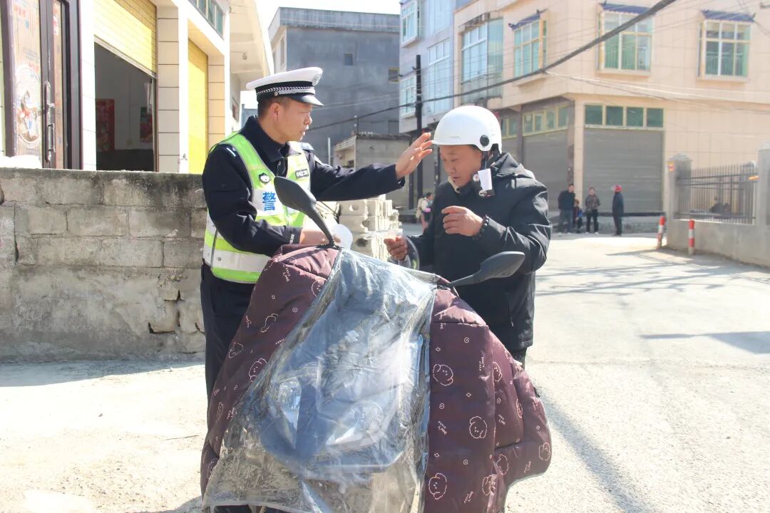 “大姐,骑车一定要戴安全头盔,二轮摩托车只能搭载一名12岁以上的人员。”在屯脚镇,交警大队针对性开展“一盔一带”宣传,通过讲解不戴安全头盔、不系安全带的危害及法律后果,强化群众交通安全意识。
